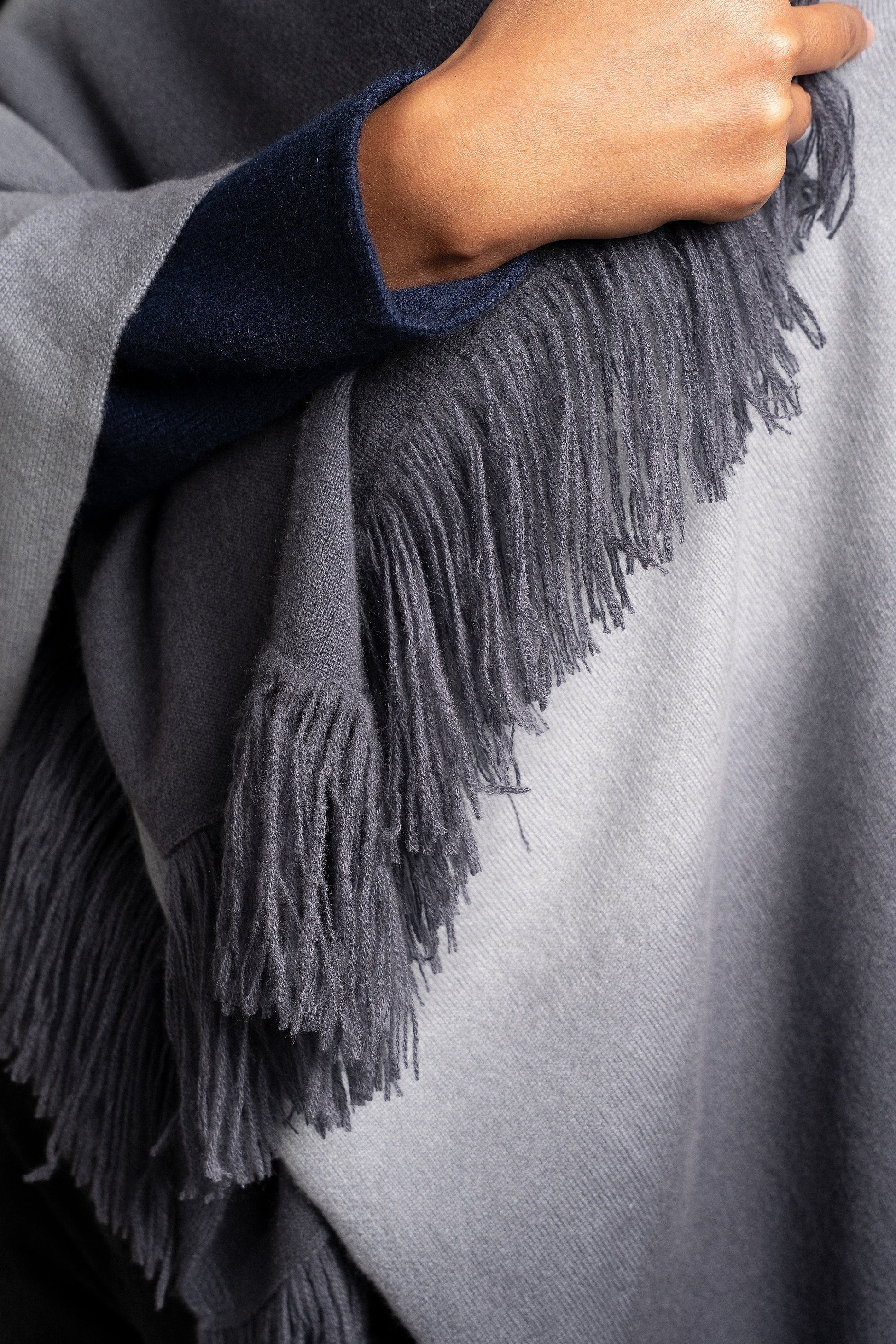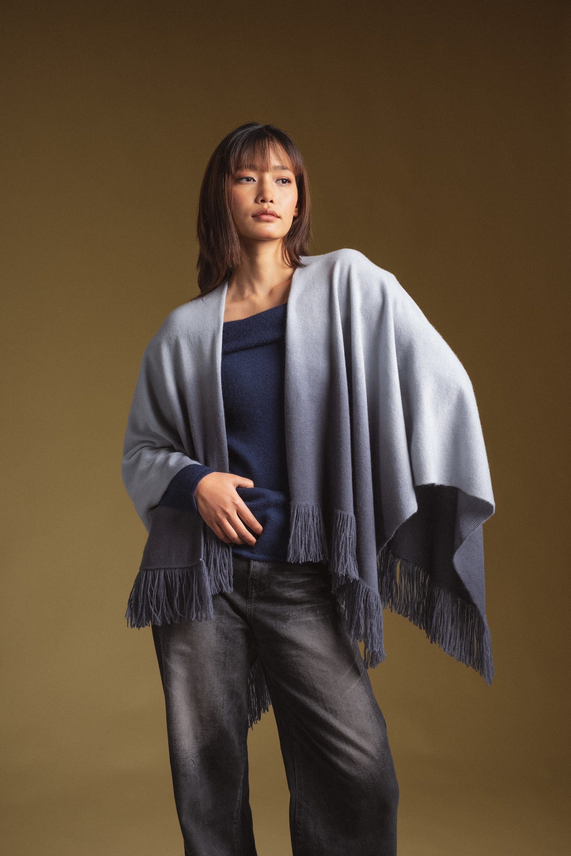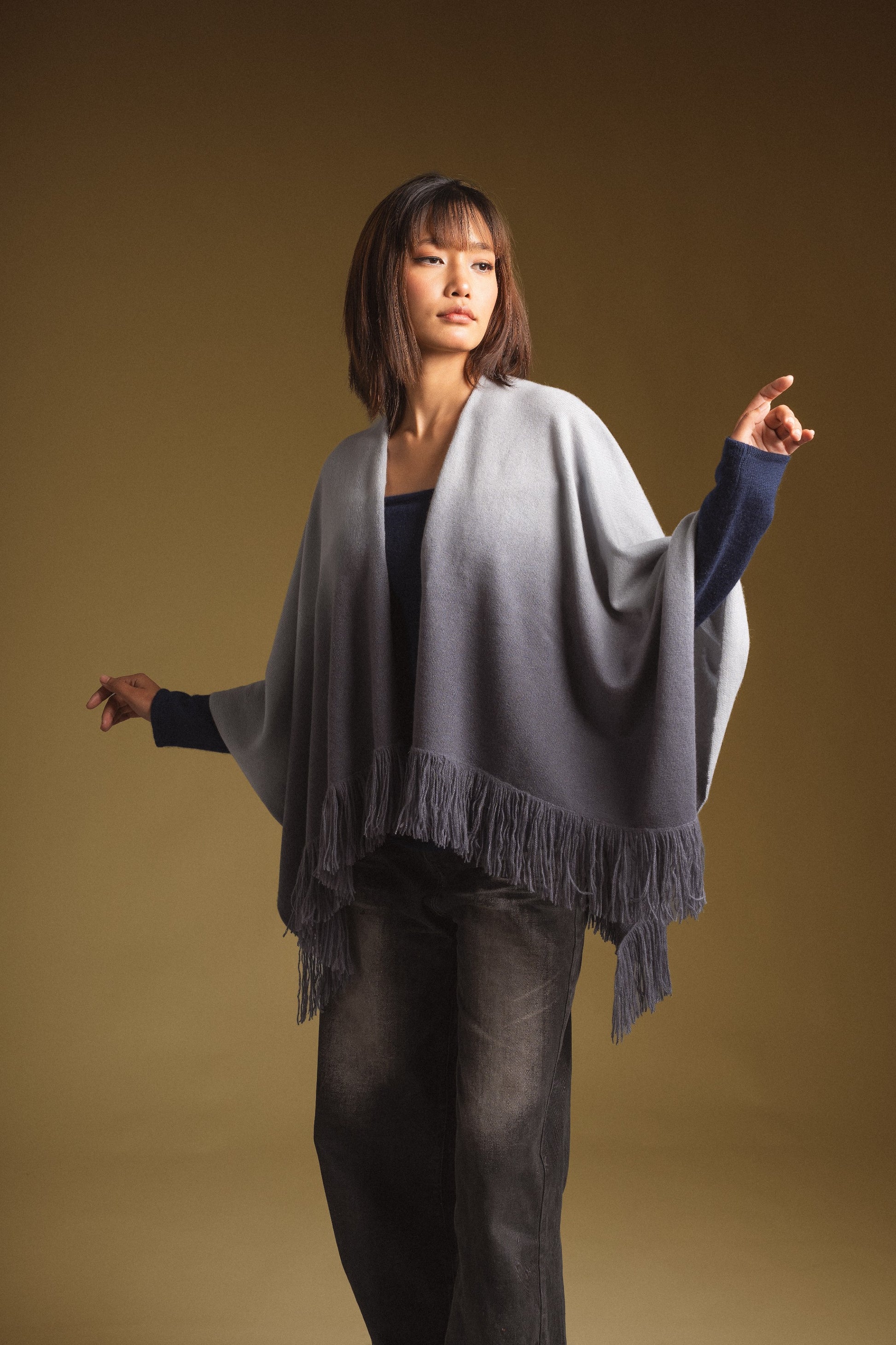 Open front knit poncho with a relaxed, draped silhouette and wide batwing shape. Features vertical knit detailing along the front opening and back panel for subtle texture with tassles alongside the hem. The colors are ombre from light to dark from top to bottom.