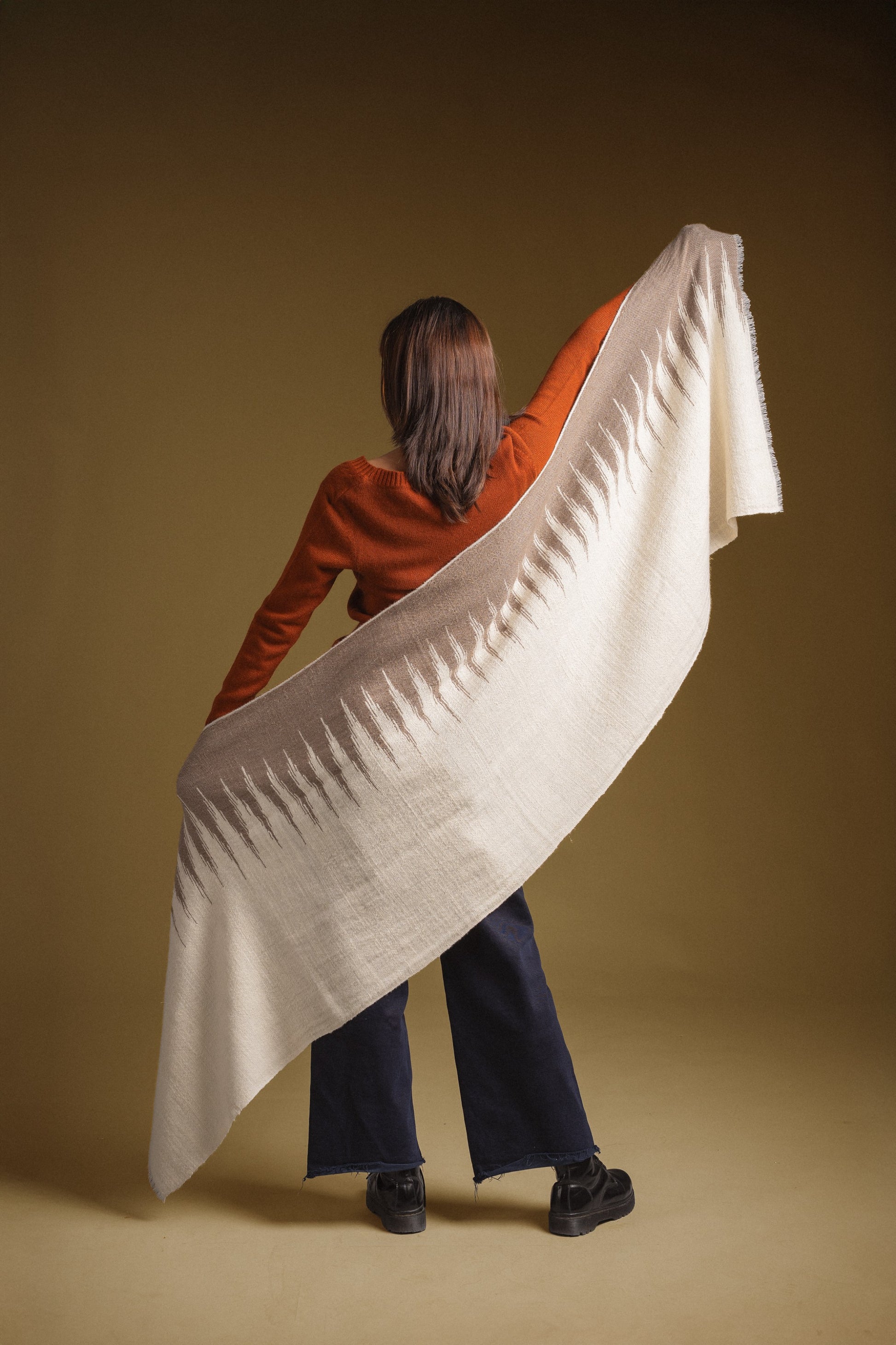 Handcrafted from handspun yarn, this scarf celebrates the beauty of artisanal irregularity and traditional techniques. Featuring a bold pattern with soft transition of color, each piece is unique in texture and expression.