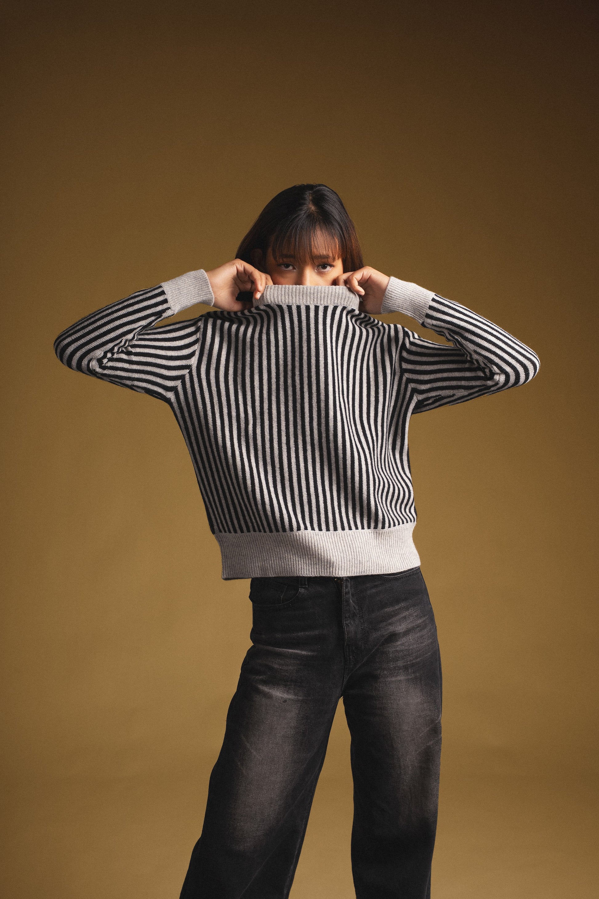 Long sleeve knitted sweater with an all-over vertical stripe rib. Features a classic crew neckline, ribbed collars, cuffs and hem for a structured finish. The silhouette offers a relaxed, slightly boxy fit with dropped shoulders for a casual and comfortable look.