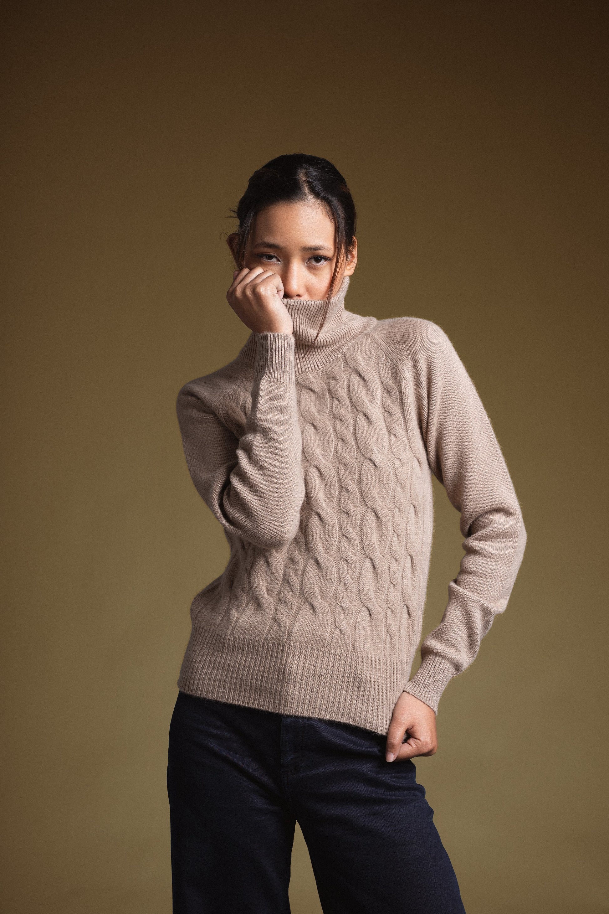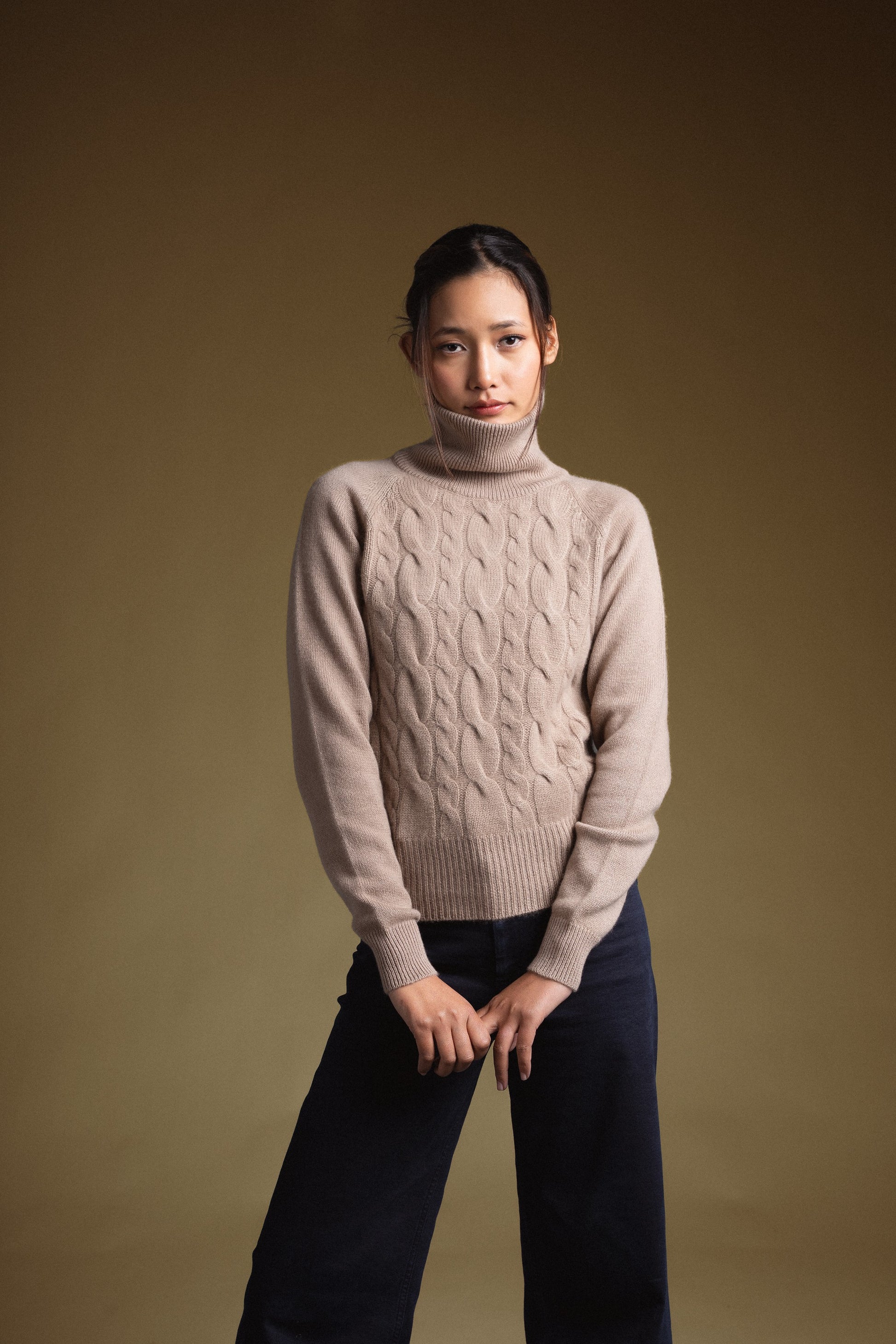 Long sleeve fitted turtleneck sweater with raised cable knit pattern on front and back panels. Features ribbed neck and hem, with plain knit sleeves for contrast.