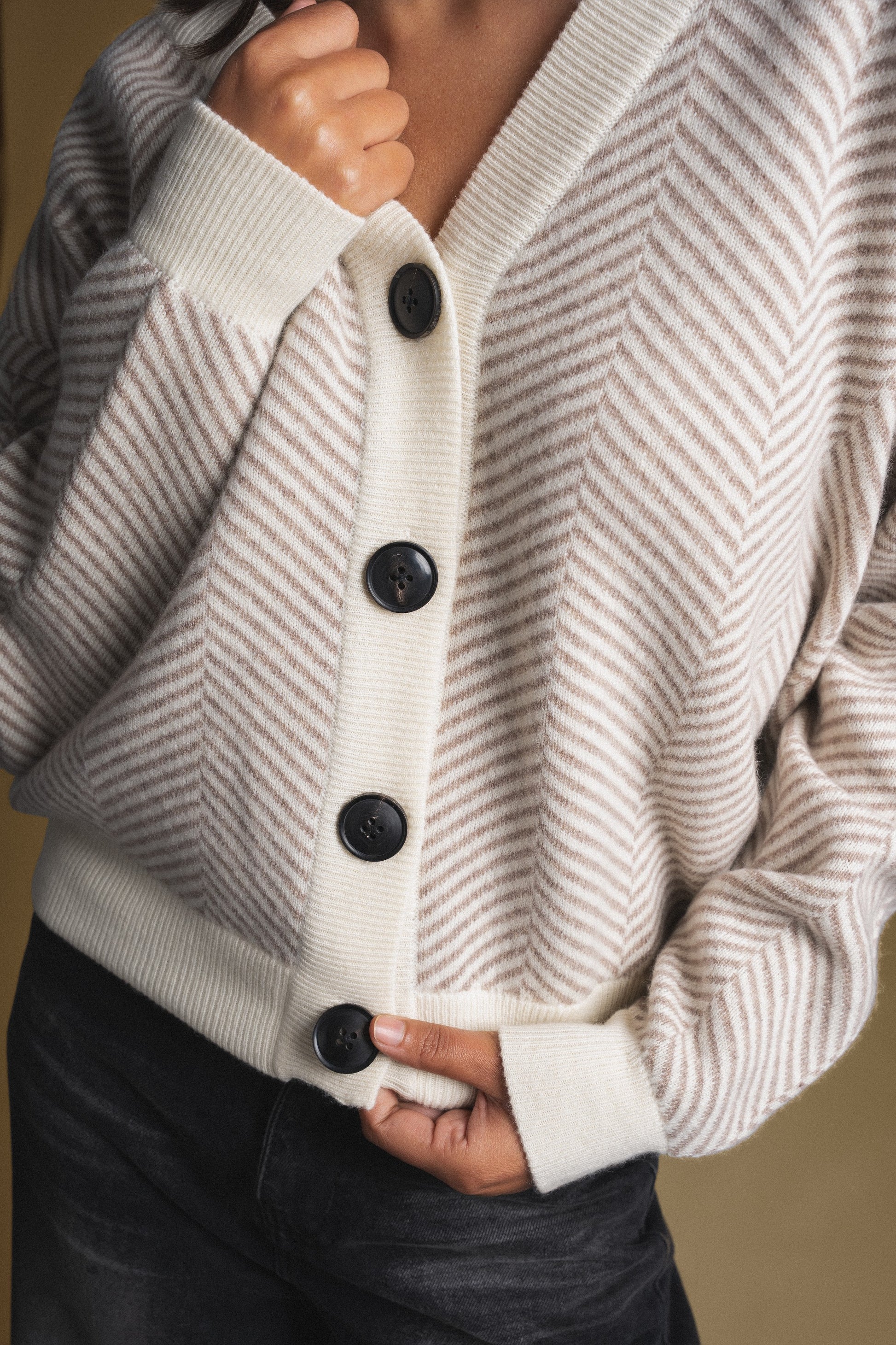 Relaxed fit cardigan in a visually striking zigzag knit structure. Features a functional button front closure with three buttons, and comfortable rib trim finishing at the cuffs and hem.