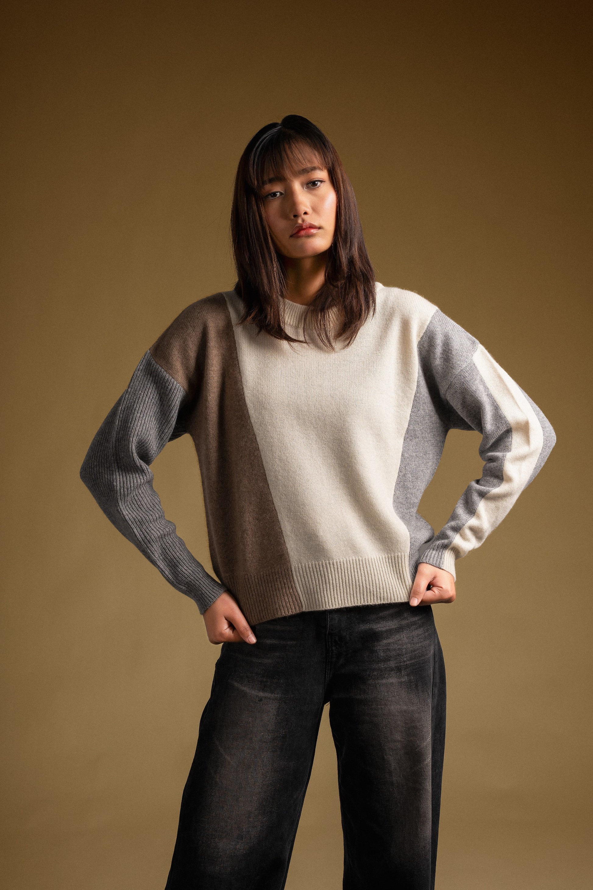 Oversized knit pullover with crew neckline and dropped shoulders. Features asymmetric front and back paneling with full length, slightly ballooned sleeves. Finished with rib knit neckband, cuffs and hem for stability and clean construction.